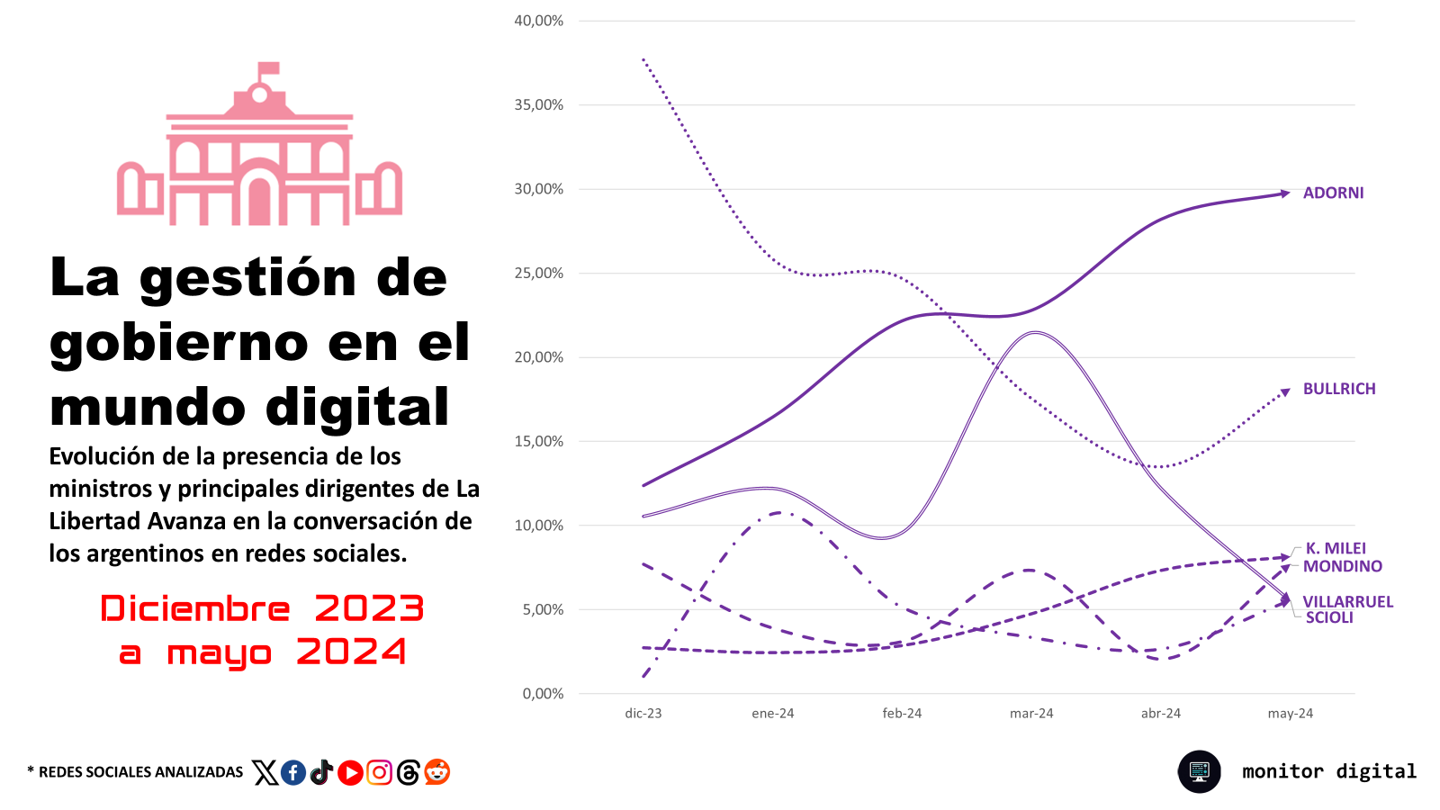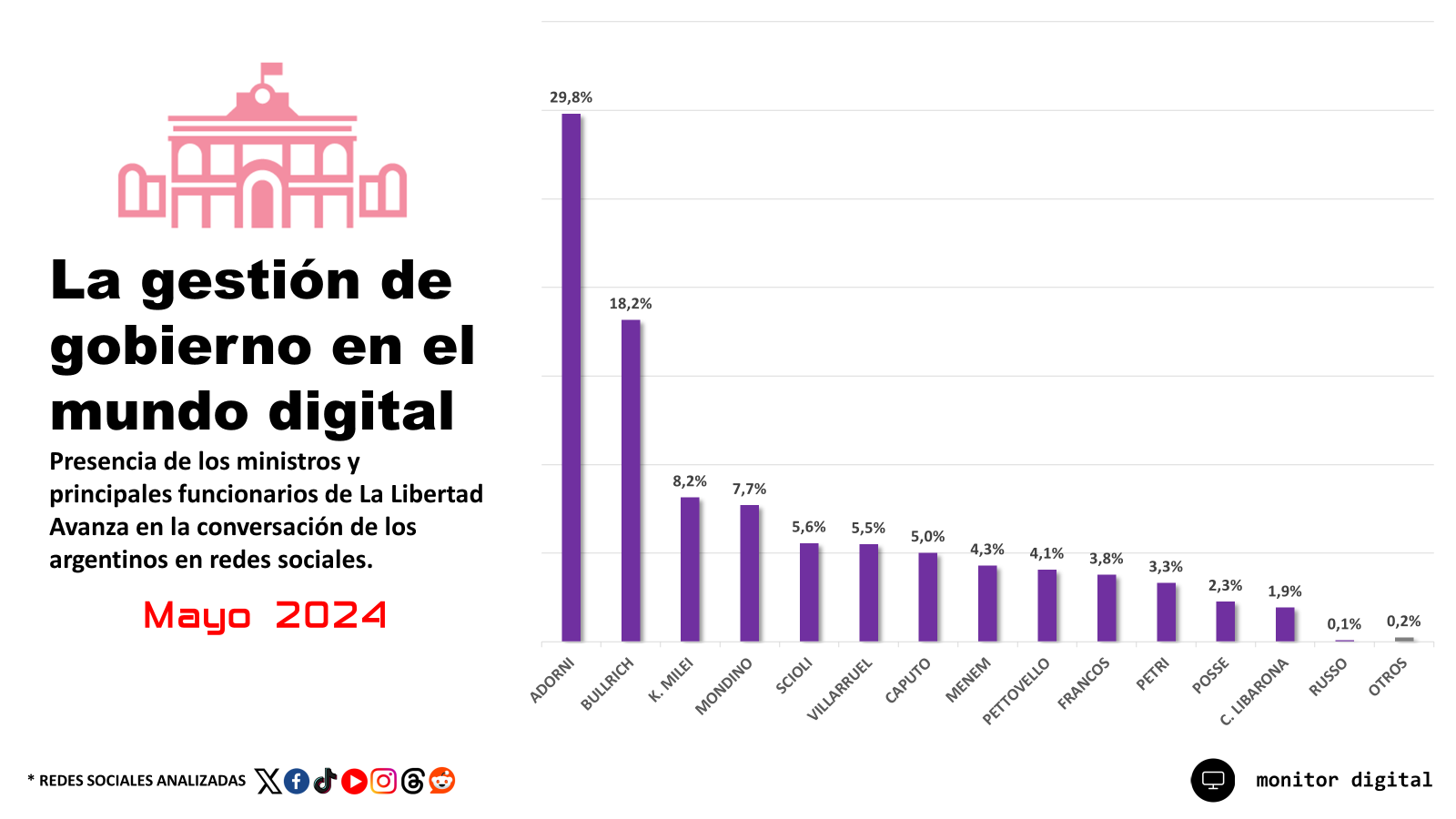 En mayo, Adorni acaparó casi el 30% de las conversaciones sobre los ministros y las figuras principales del gobierno libertario, muy por encima de otros ministros como Patricia Bullrich, que tiene menos del 20%.