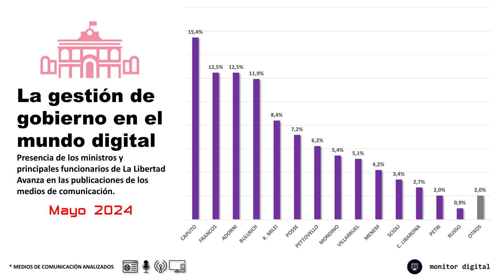 En mayo, Caputo fue el ministro más mencionado en las publicaciones mediáticas, con poco más del 15% de las menciones a los principales ministros y funcionarios del gobierno libertario.