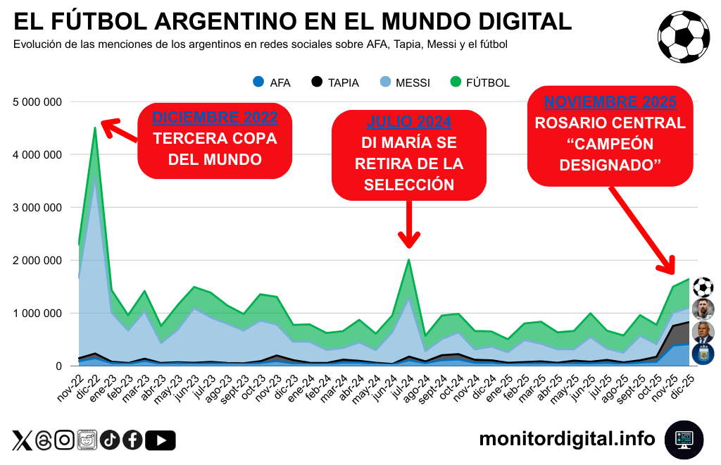 El resultado es un desplazamiento nítido del foco: en el cierre de 2025, AFA y Tapia dejan de ser actores secundarios y pasan a disputar el centro de la escena digital con Messi y el fútbol en general.