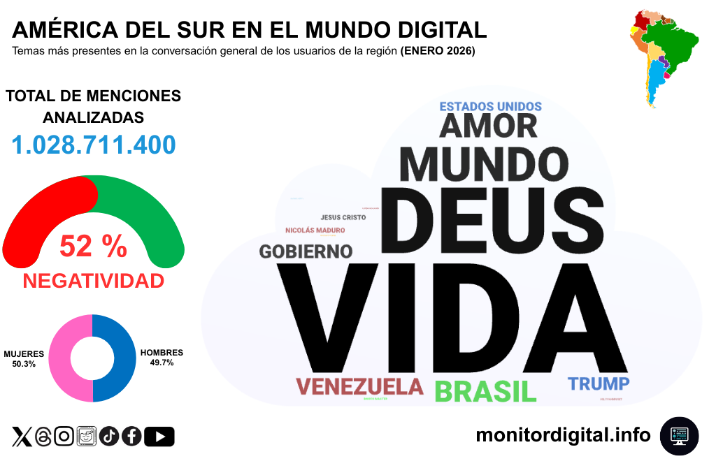 El tablero de enero 2026 de las redes sociales de América del Sur reunió 1.028.711.400 menciones y un reparto de género casi perfecto (50,3% mujeres y 49,7% hombres).