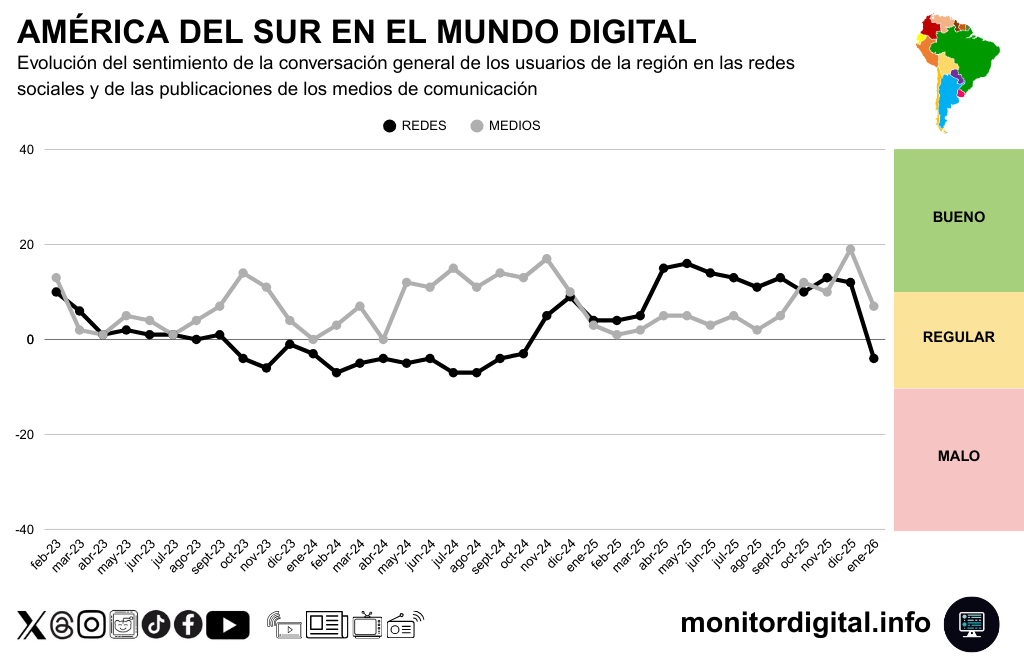La serie temporal que muestra la evolución del sentimiento de las publicaciones de los usuarios de América del Sur en redes sociales comparó redes (línea negra) y medios (línea gris) desde feb-23 hasta ene-26.