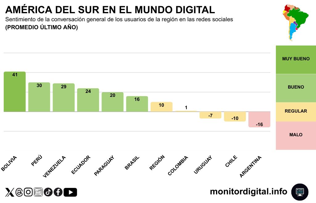 El promedio del último año del sentimiento de las publicaciones de los usuarios de América del Sur ordenó el mapa así: Bolivia (+41 puntos NSR) lideró, luego Perú (+30) y Venezuela (+29), con Ecuador (+24) y Paraguay (+20) en zona buena.