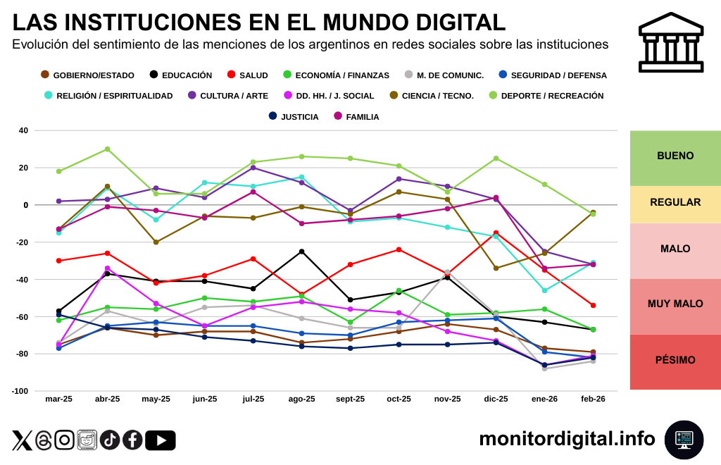 La evolución mensual del sentimiento sobre las instituciones argentinas deja otra señal clave.