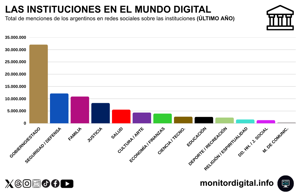 Durante el último año, esa categoría reúne cerca de 32 millones de menciones, muy por encima del resto del mapa institucional. Bastante más atrás aparecen Seguridad/Defensa, Familia y Justicia, que integran el segundo pelotón en volumen.