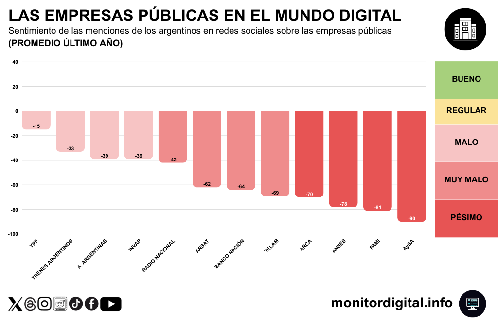 YPF, ANSES, ARCA, PAMI y Banco Nación se quedaron con el grueso de las menciones, aunque ninguna empresa pública alcanzó un promedio anual positivo de sentimiento.