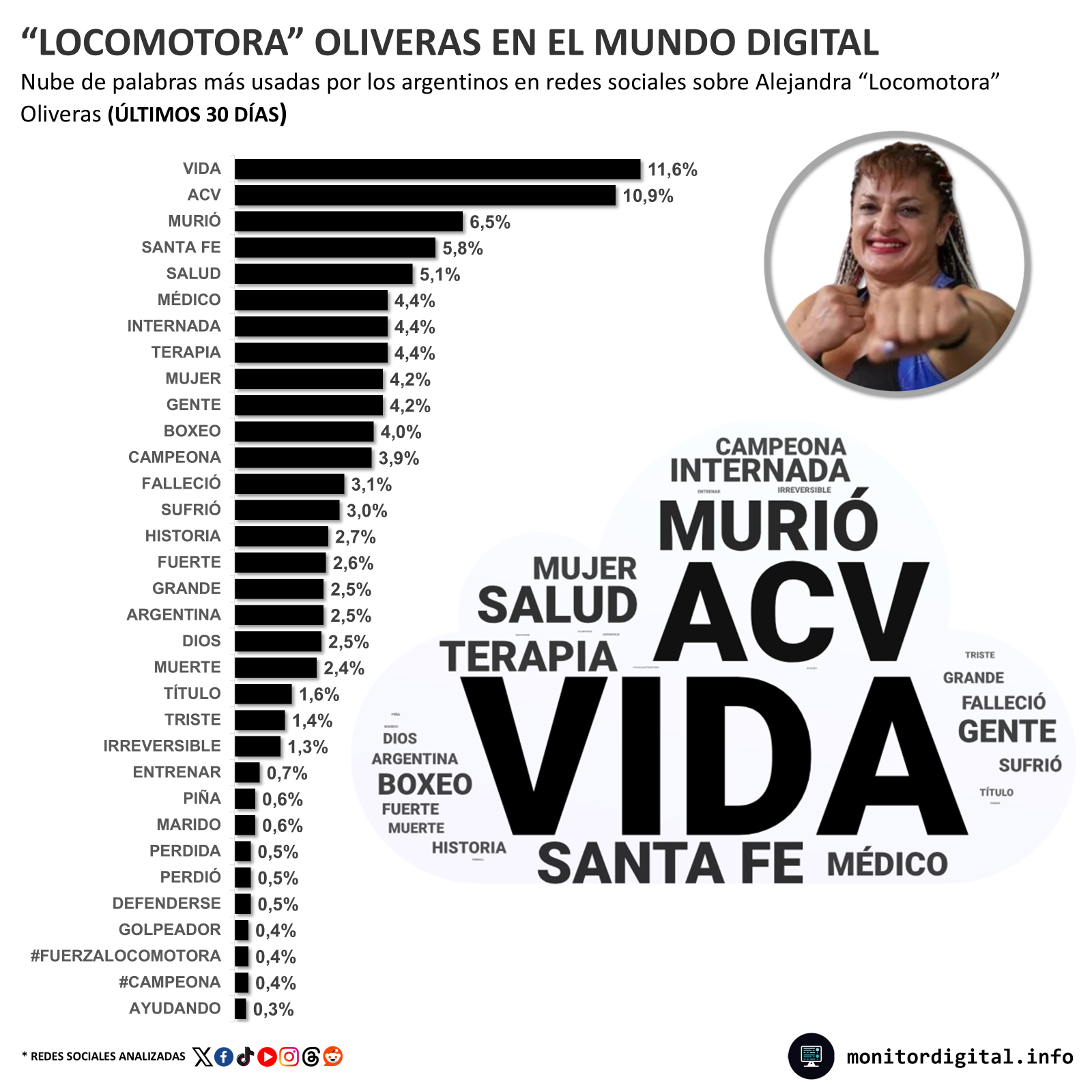 Analizando la narrativa de los argentinos sobre Alejandra Oliveras, el término más mencionado en la conversación de los últimos 30 días fue “vida” (11,6%), lo cual no deja de resultar llamativo en el contexto de la internación y posterior muerte de la exboxeadora.