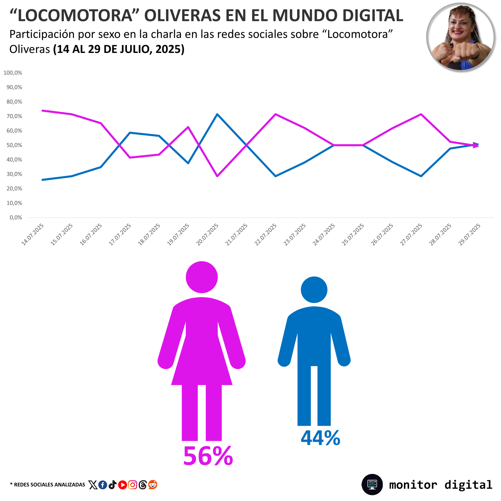 La evolución de la conversación digital sobre Alejandra “Locomotora” Oliveras, observada entre el 14 y el 29 de julio de 2025, muestra un dato revelador: la participación femenina predominó a lo largo de casi todo el período analizado, alcanzando un 56% del total frente al 44% de los varones.