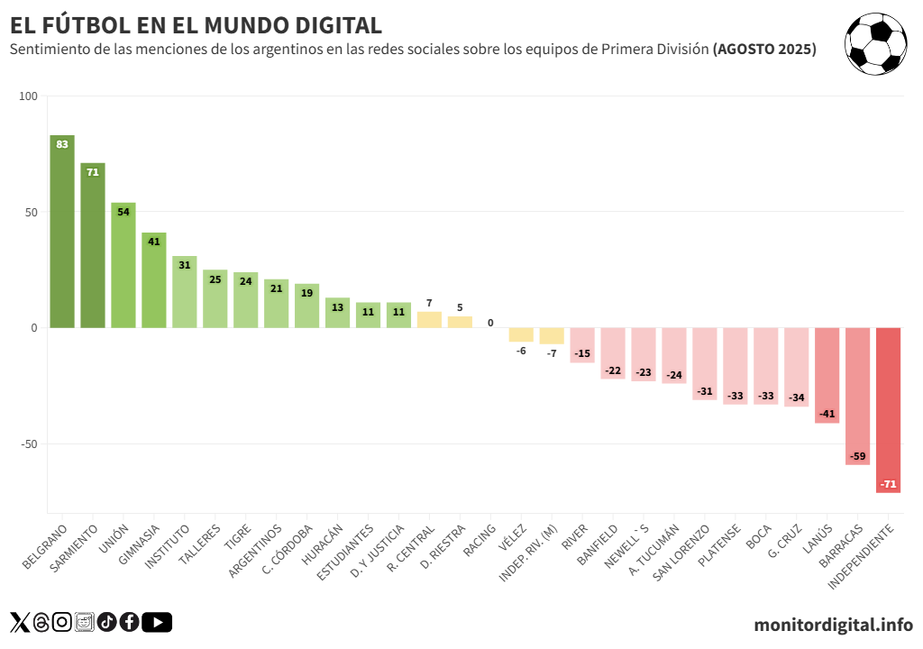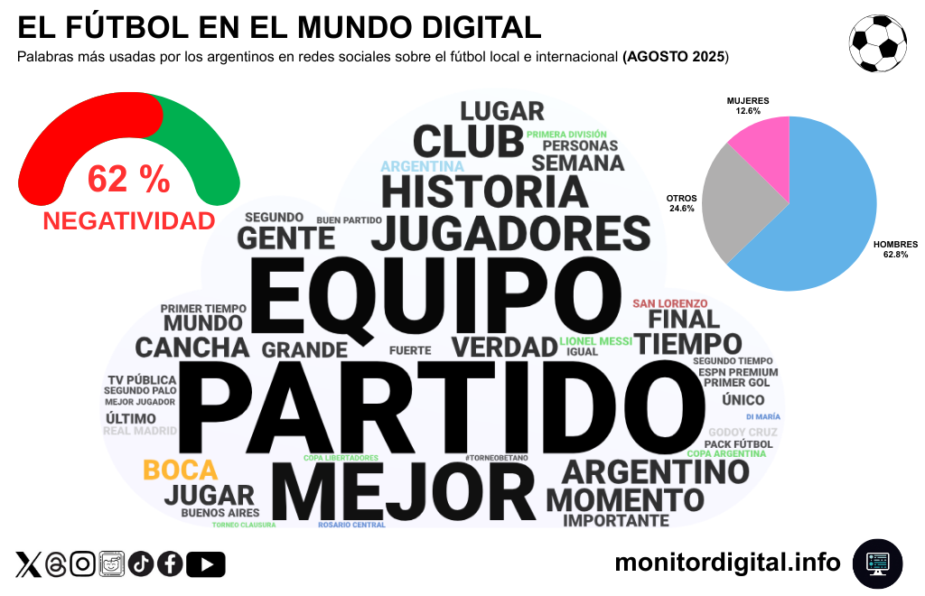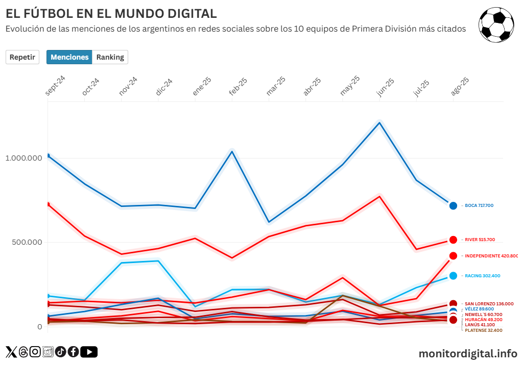 Durante agosto, el fútbol —tanto local como internacional— ocupó un lugar central en la charla digital argentina.