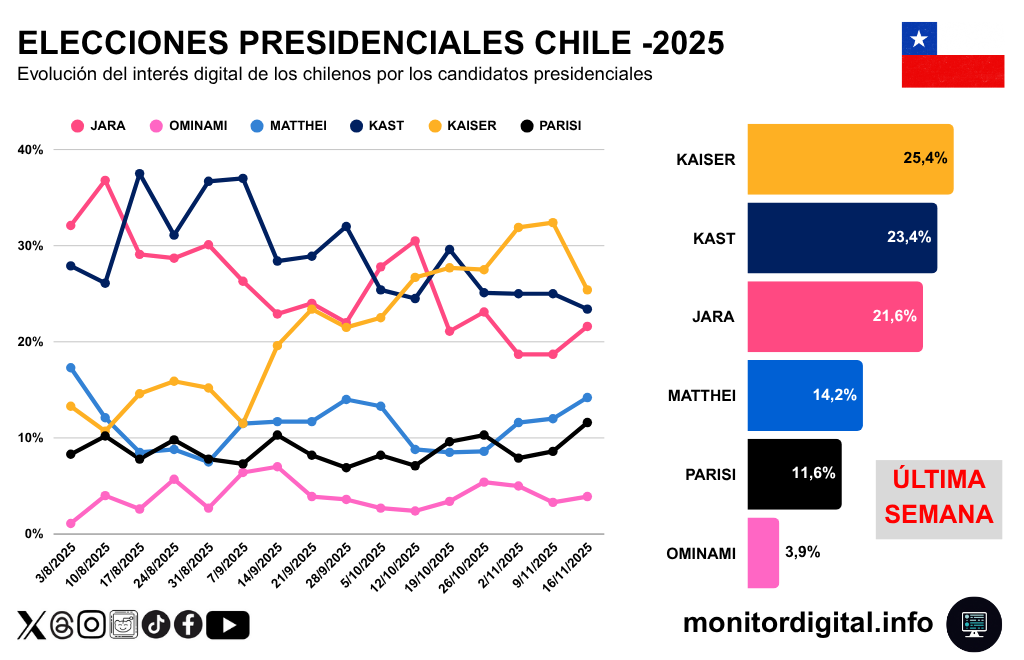 Aproximadamente desde el 20 de septiembre, Kaiser rompe la barrera del 20% y entra en un período de crecimiento sostenido que lo lleva a cerrar la última semana con 25,4% de interés digital, la cifra más alta del ecosistema chileno.