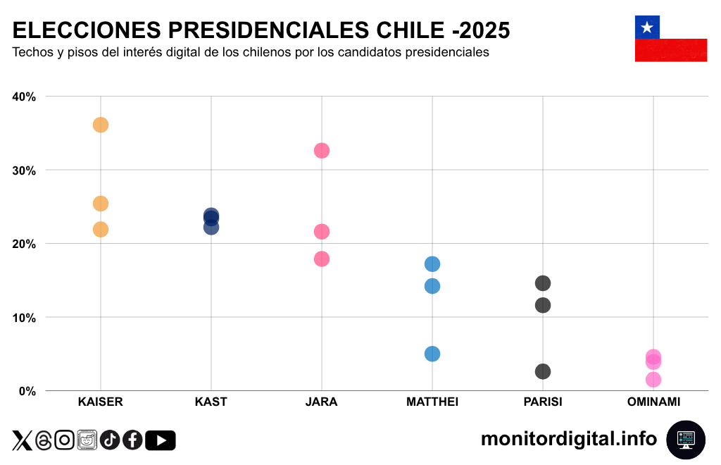 Los techos y pisos del interés digital confirman un tablero electoral chileno fracturado entre dos energías centrales: