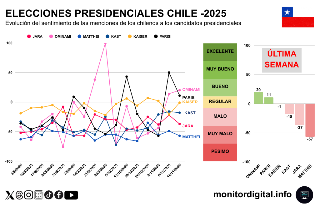 Las curvas históricas del gráfico que muestra la evolución del sentimiento en redes sociales sobre los candidatos presidenciales chilenos muestran un dato ineludible:
