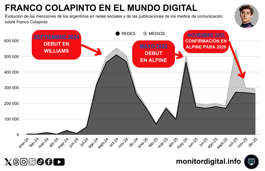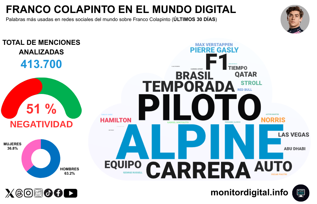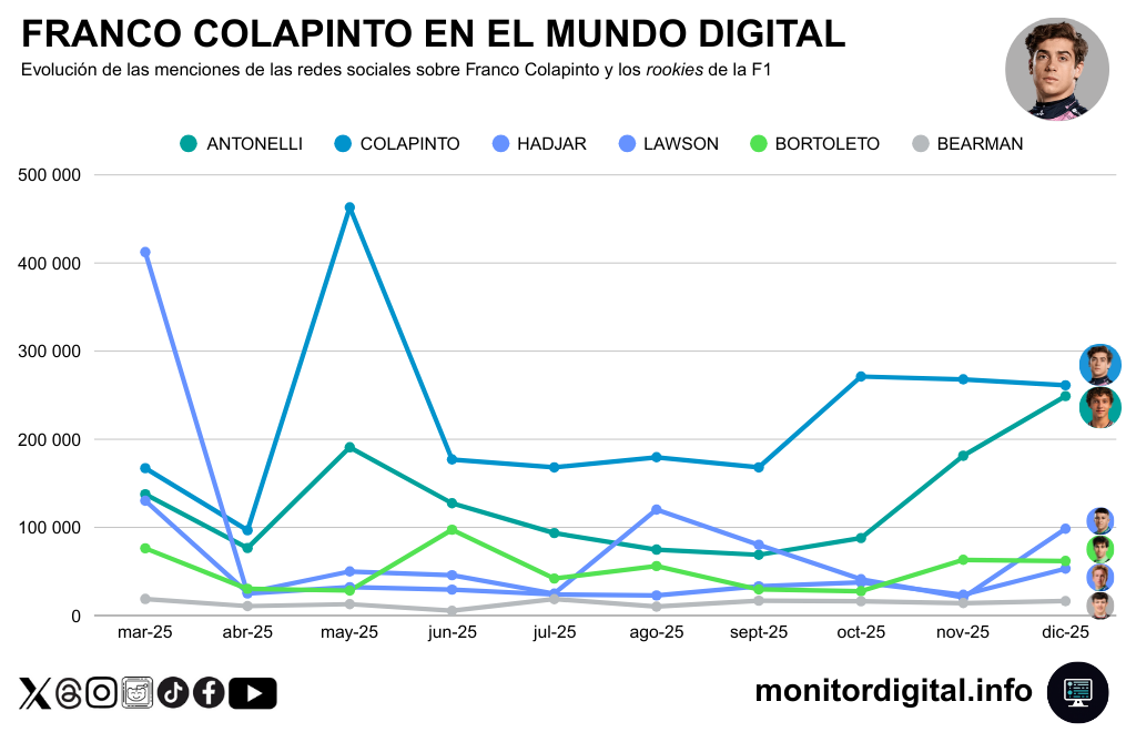 Frente a Antonelli (1,28 millones de menciones), Lawson (693.400), Hadjar (637.600) y Bortoleto (512.700), Colapinto se va a 2,22 millones en el año.
