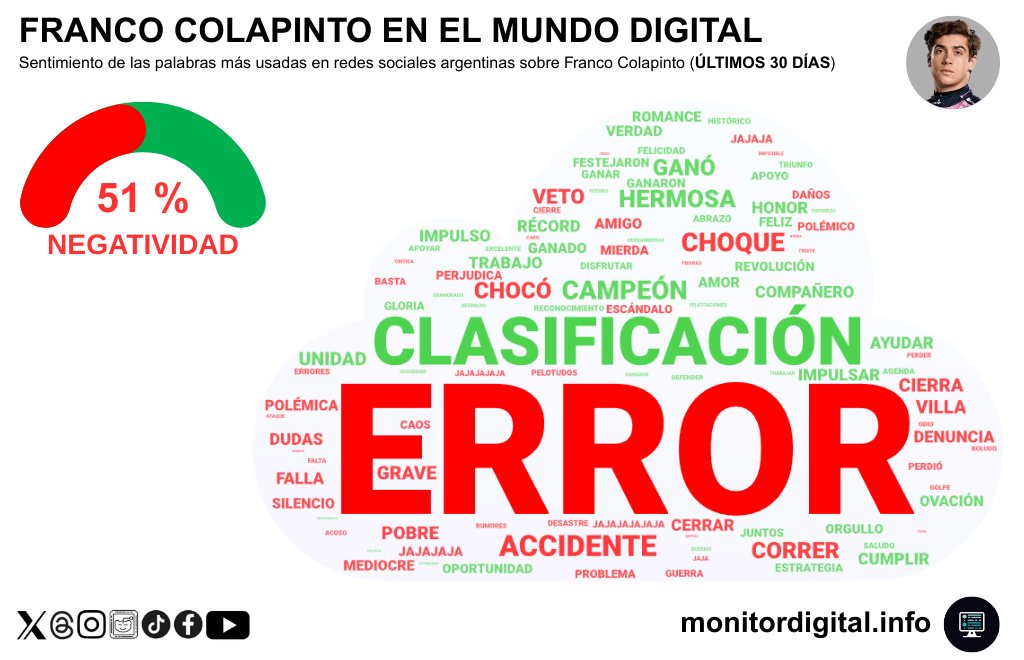 Pero ese protagonismo vino con factura: un 51% de negatividad que expuso la presión extrema sobre cada error, choque o clasificación fallida.