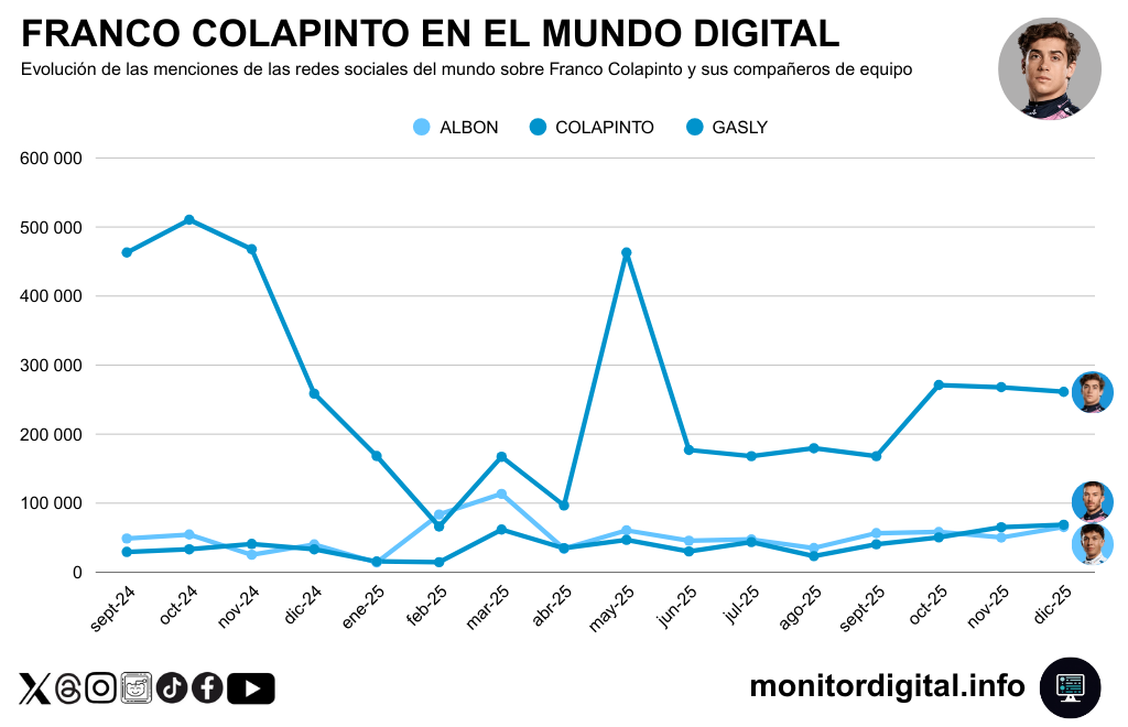 El contraste con Pierre Gasly en Alpine es similar: 465.600 menciones para el francés en toda la temporada 2025, menos de un cuarto del volumen de Colapinto.