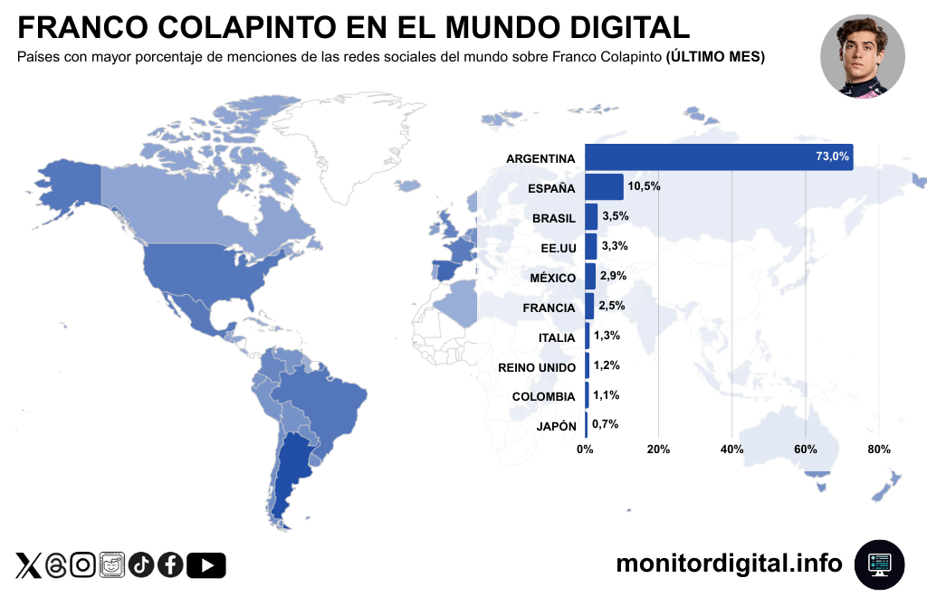 En el mapa general de menciones en redes sociales de los pilotos de la Fórmula 1, Franco corre en la liga de los grandes.