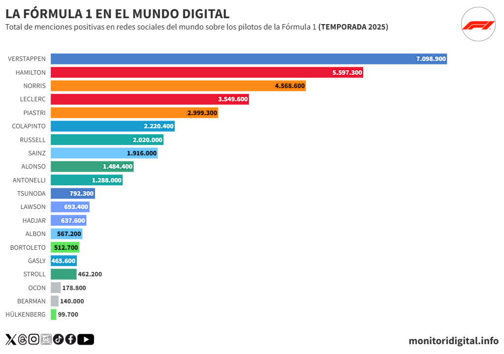 El ranking anual lo muestra sexto en conversación digital con 2,22 millones de menciones, sólo detrás de Verstappen, Hamilton, Norris, Leclerc y Piastri.