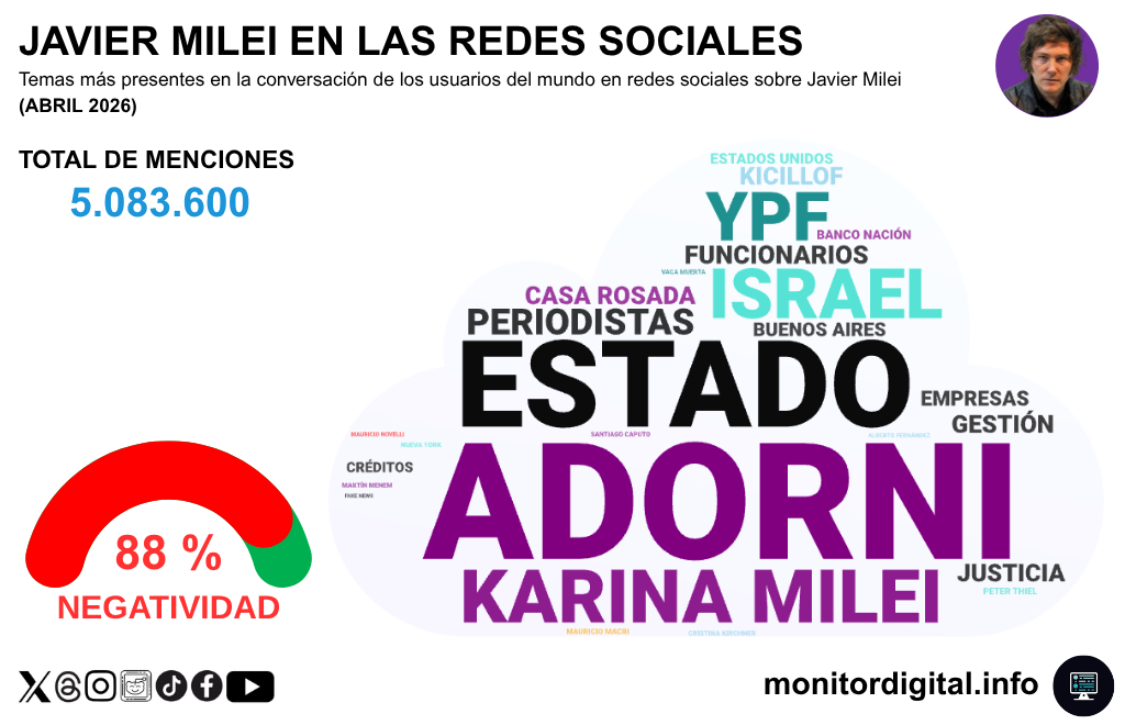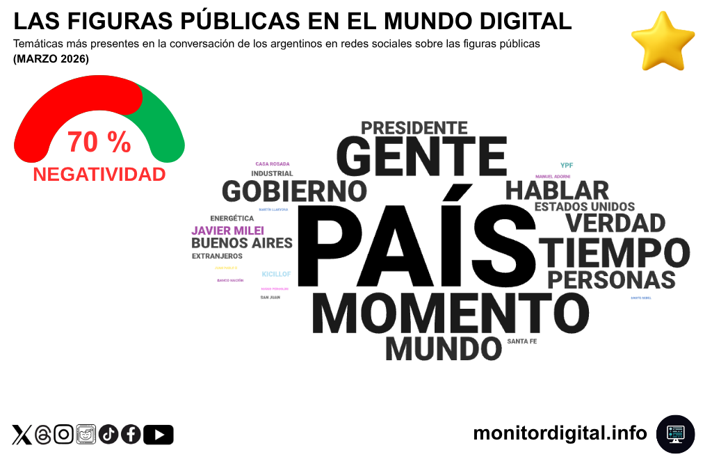 La conversación general de abril sobre las figuras públicas argentinas revela una negatividad del 70%, un porcentaje que marca el clima estructural desde el cual se interpreta cualquier nombre propio.