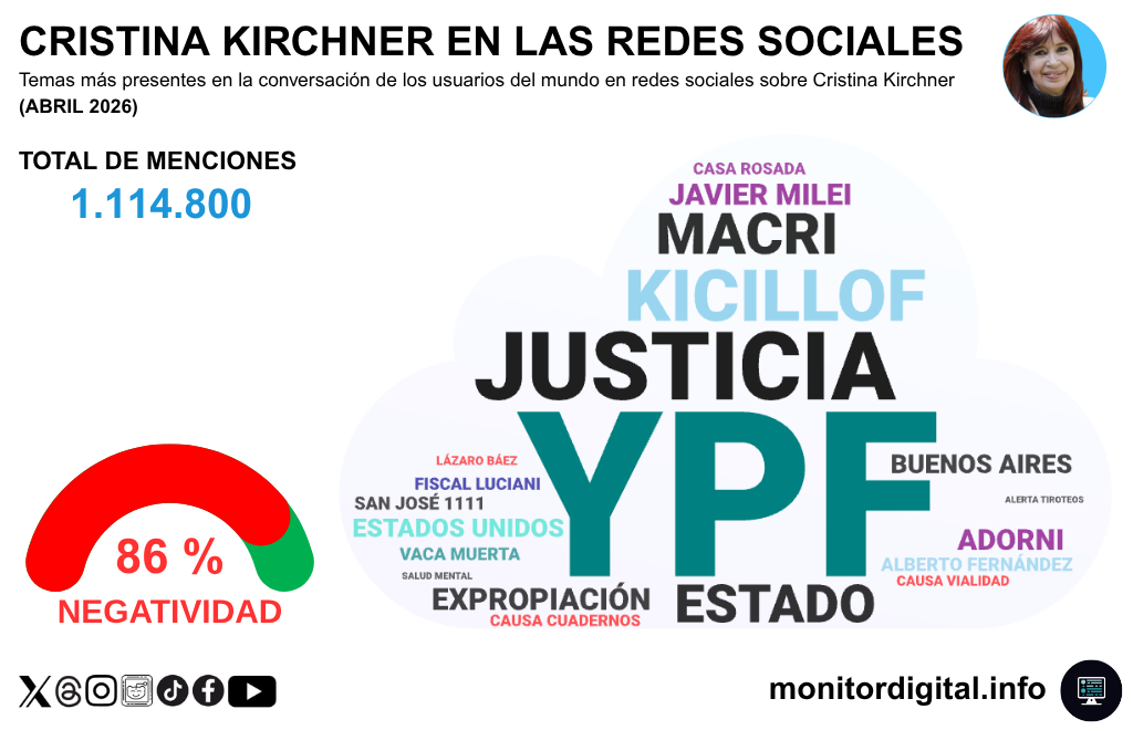 Cristina Kirchner queda asociada a “YPF”, “Justicia”, “Kicillof”, “Macri”, “Estado”, “expropiación”, “causa Vialidad” y “causa Cuadernos”.