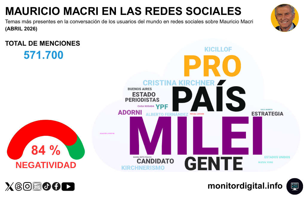 Mauricio Macri, por su parte, queda entre “Milei”, “PRO”, “país”, “gente”, “candidato”, “estrategia”, “YPF” y “kirchnerismo”.