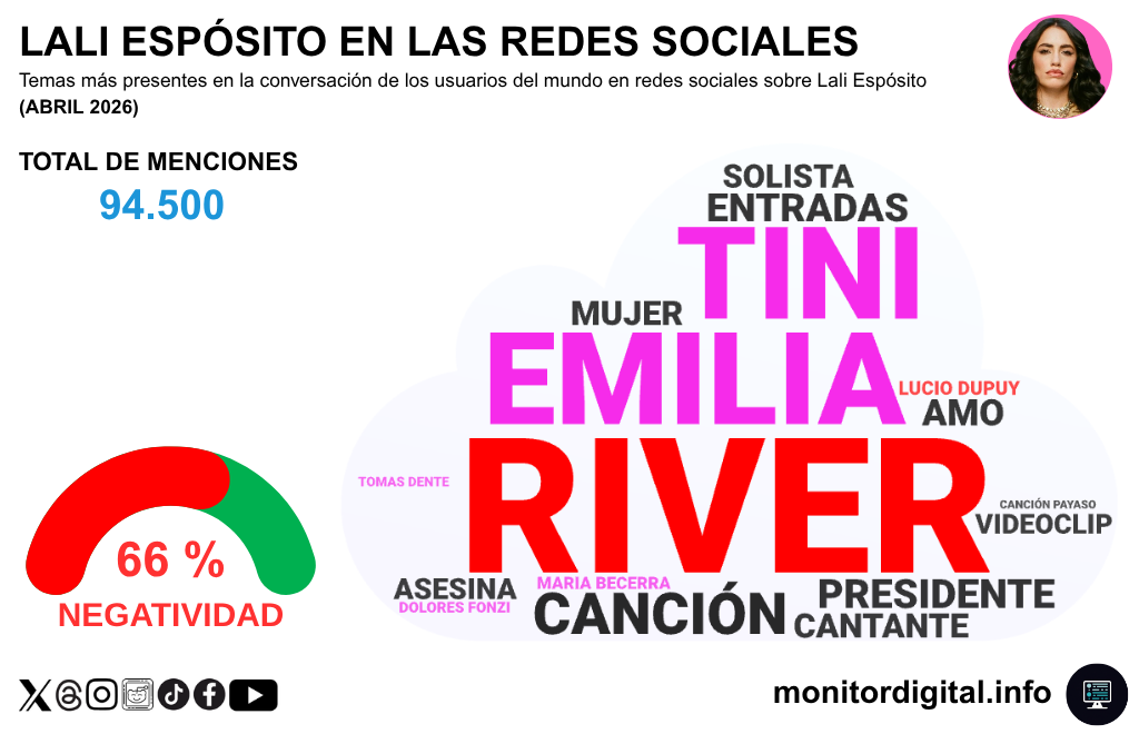 Lali Espósito, otra de las figuras públicas más mencionadas en las redes argentinas, aparece con 94.500 menciones en abril y 66% de negatividad.