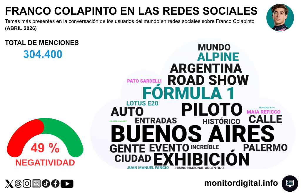 - Colapinto aparece asociado a “Buenos Aires”, “Fórmula 1”, “piloto”, “road show”, “Argentina”, “Alpine”, “exhibición” y “evento increíble”.