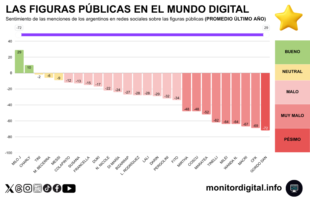 La conversación digital argentina sobre las figuras públicas está dominada por una lógica áspera: política, economía, conflicto social, temas judiciales, crisis institucional...