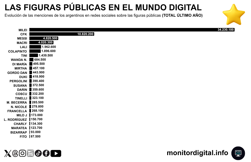 En ese mapa, Javier Milei concentra una distancia abrumadora: 34,2 millones de menciones en el último año, muy por encima de Cristina Kirchner, Lionel Messi, Mauricio Macri, Lali Espósito y Franco Colapinto.