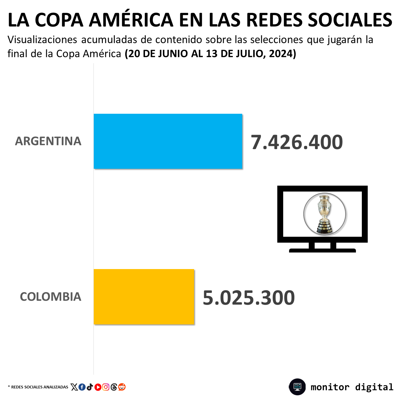 Incluso, en visualizaciones de contenido en las redes sociales de los usuarios geolocalizados en los países participantes de la Copa América, la Argentina también dominó a Colombia hasta el día previo a la gran final que terminó ganando por 1 a 0.