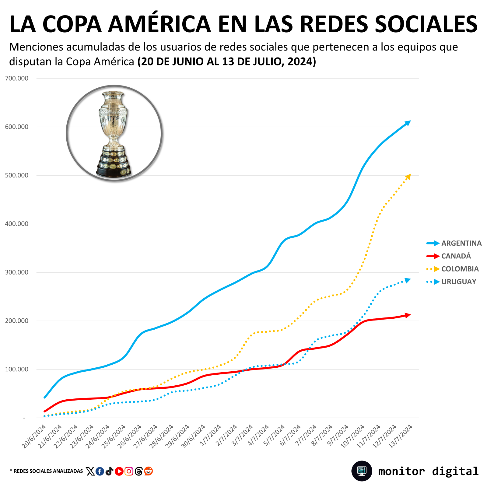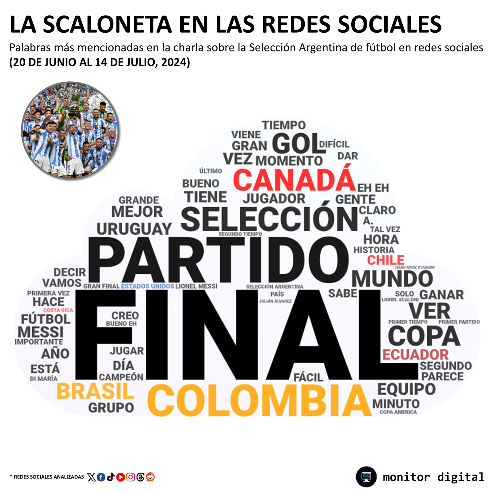 Tomando sólo las cuatro selecciones que llegaron a la instancia final, la Scaloneta logró imponerse a Colombia con 613 mil 700 citas en redes sociales por parte de los usuarios geolocalizados en los países que participaron de la Copa.