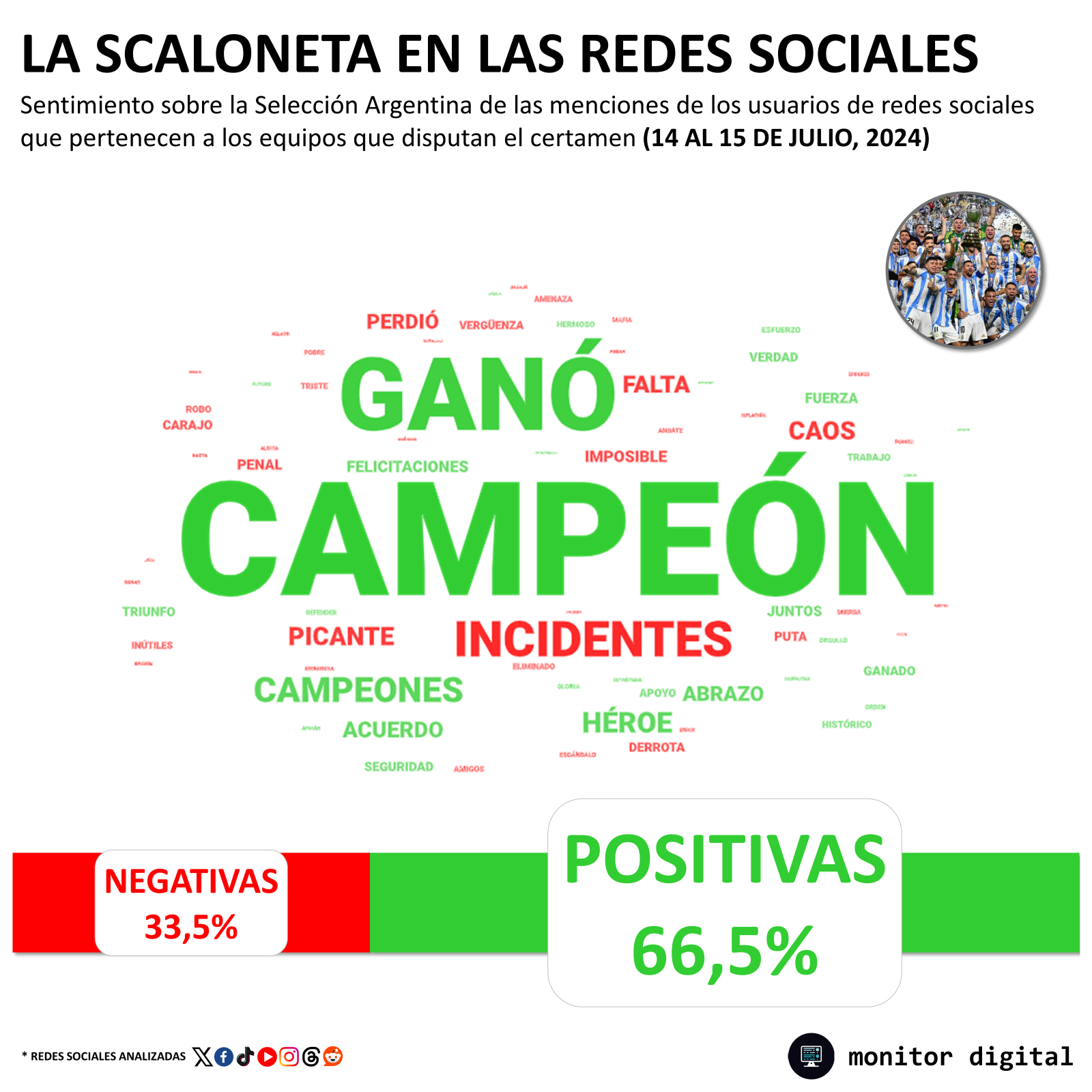 En cuanto a la valoración de las redes sociales sobre la Selección Argentina, "campeón" fue el término más presente expresando sentimiento en la charla acerca del conjunto albiceleste.