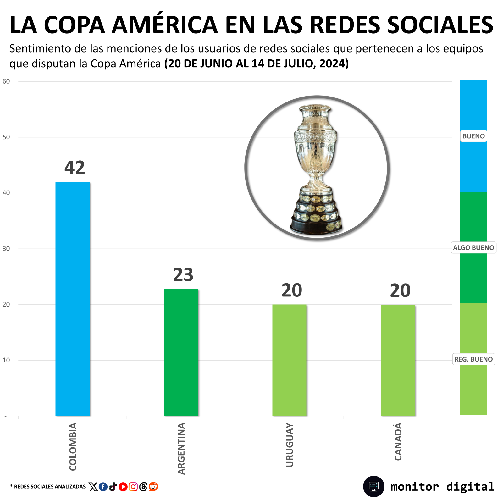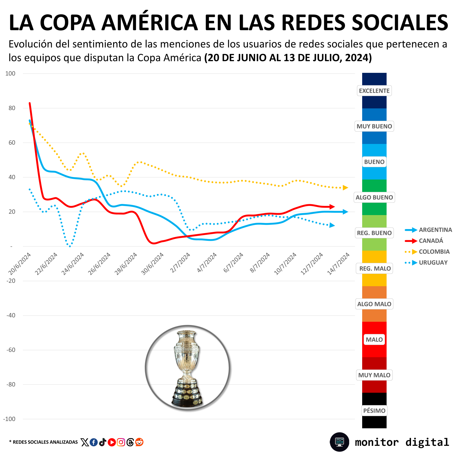 De hecho, Colombia cerró la Copa América con el mejor promedio de sentimiento de charla digital, muy por encima de las otras tres selecciones que llegaron a la instancia final.