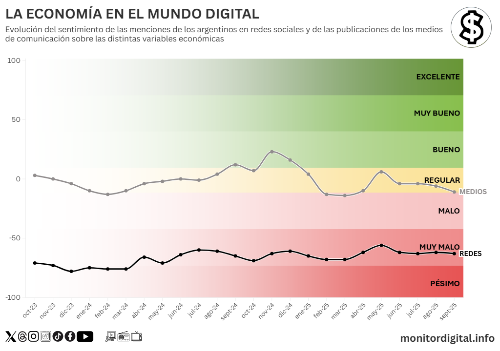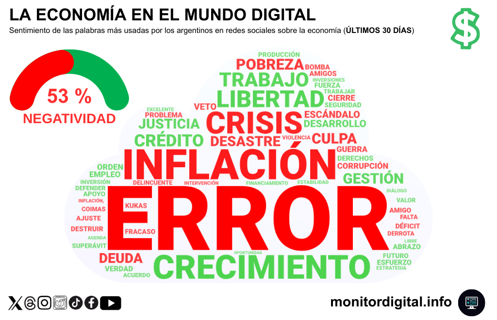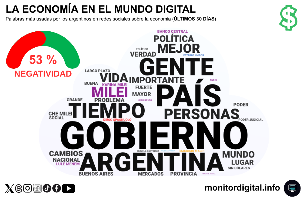 En cuanto al sentimiento de la charla económica en las redes argentinas, la negatividad del 53% le da un continente de rechazo moderado, pero sostenido.