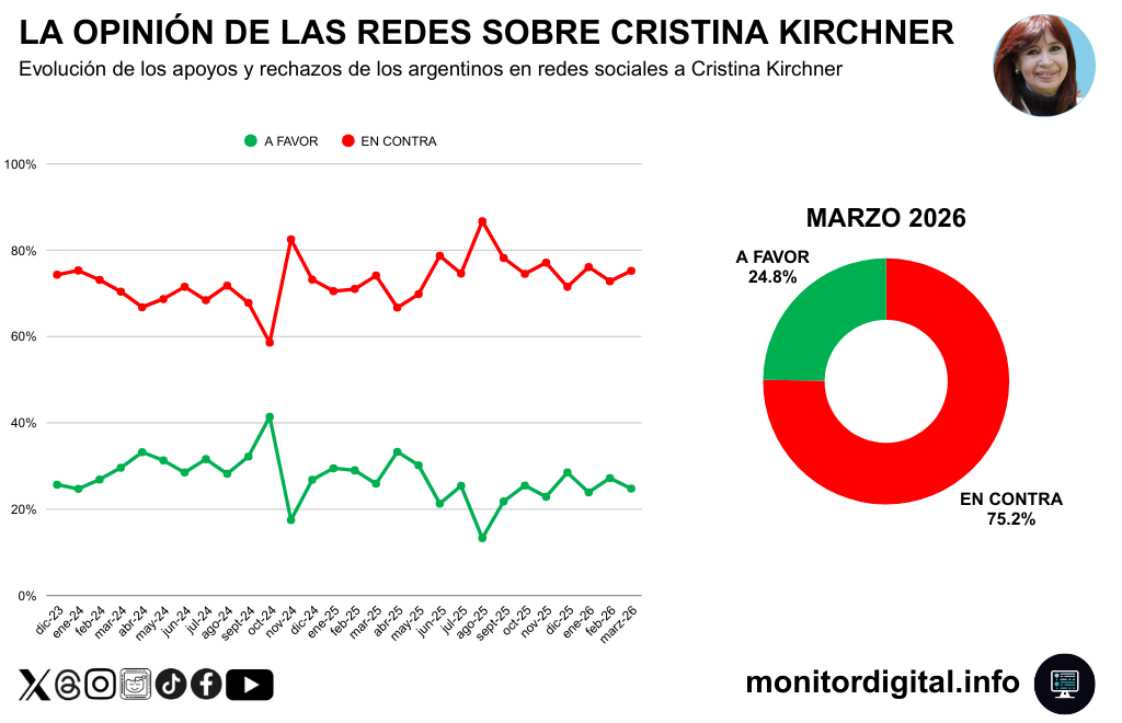En marzo de 2026, Cristina Kirchner registra 24,8% de apoyos contra 75,2% de rechazos.
