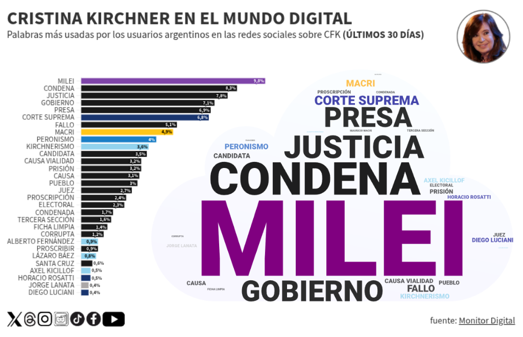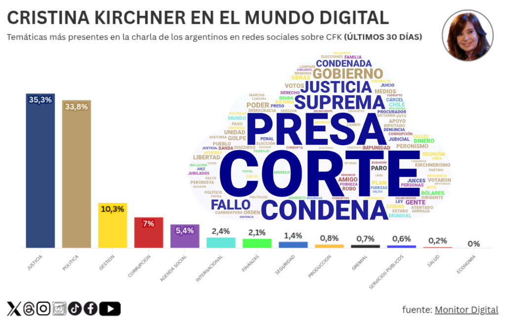En el análisis de Monitor Digital sobre la narrativa del último mes en redes sociales sobre CFK, más del 35% de las menciones correspondieron a temas judiciales.