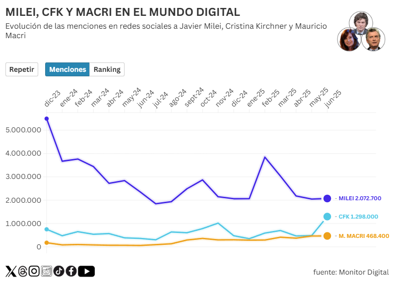 De mayo a junio, las menciones a la expresidenta crecieron casi un 170%, mientras que las citas a Javier Milei se incrementaron apenas un 1,1%.