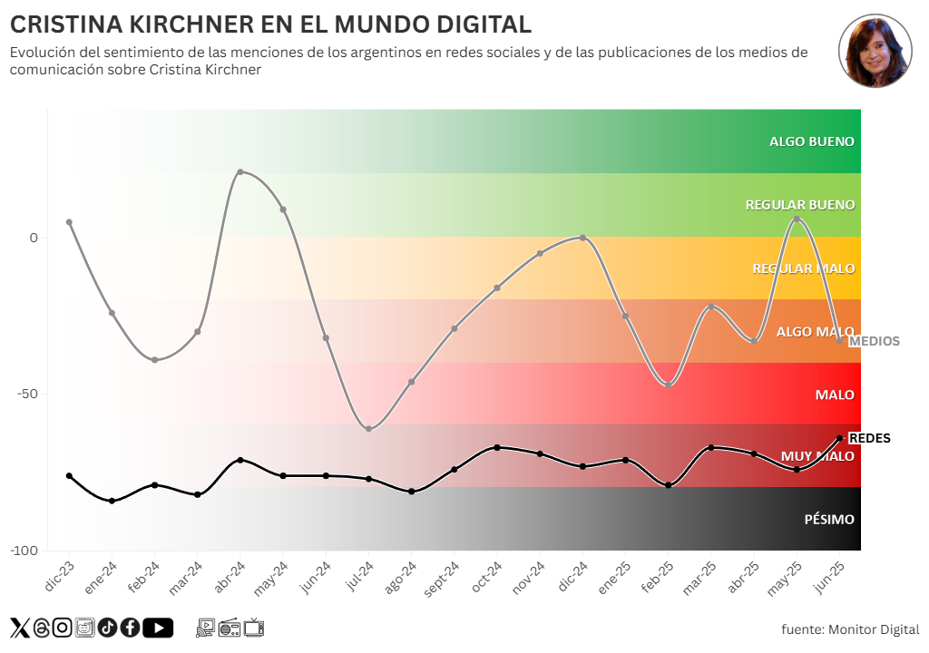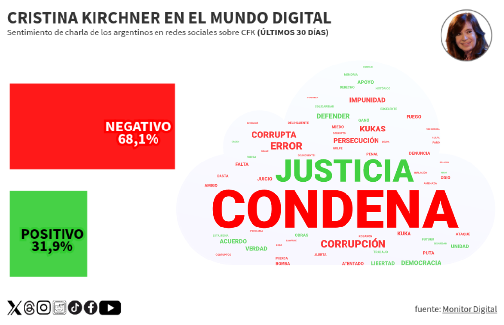 La negatividad en la conversación pública en torno a la figura de Cristina Kirchner dio un fuerte salto tras la confirmación de la condena en al causa Vialidad.