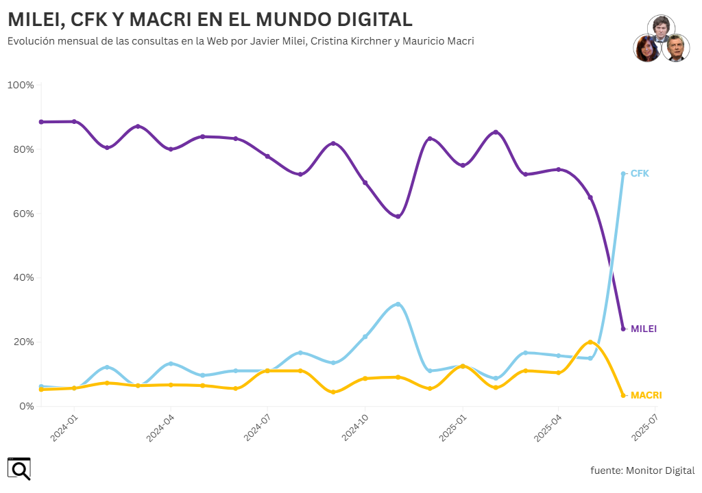 Este juego entre la expresidenta y el actual mandatario hizo replegar el interés digital por el otro exmandatario, Mauricio Macri.