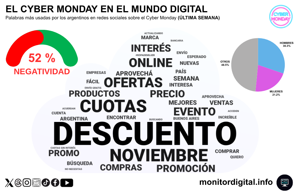 El Cyber Monday 2025 generó una fuerte conversación digital en la última semana, dominada por el interés en descuentos y cuotas, pero con un tono crítico que marcó el pulso del evento.