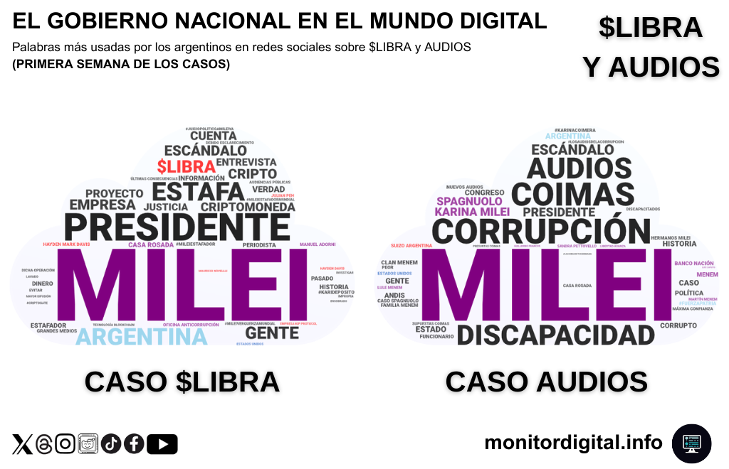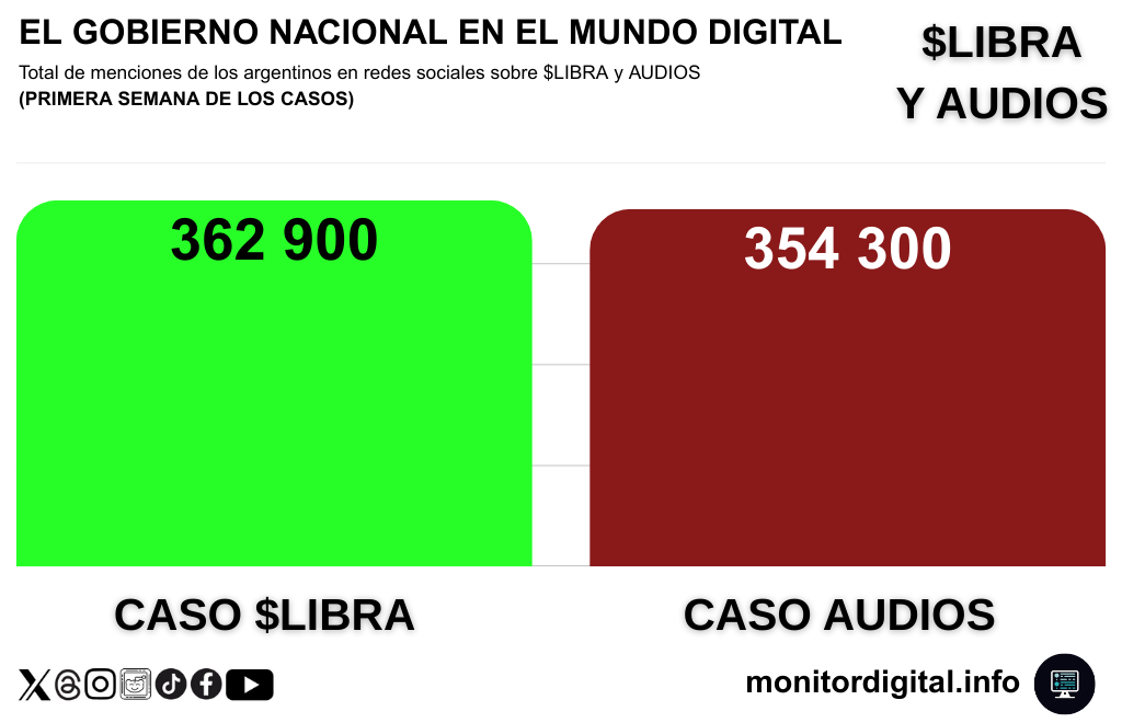 En la primera semana de cada episodio analizado en nuestro estudio de Monitor Digital, el impacto fue similar en términos de volumen entre la polémica por la difusión de la criptomoneda $LIBRA desde las cuentas de redes sociales del presidente, Javier Milei, y el escándalo con los audios del extitular de la Agencia Nacional de Discapacidad, Diego Spagnuolo, revelando un supuesto entramado de corrupción con dinero destinado a la compra de medicamentos para pacientes discapacitados: