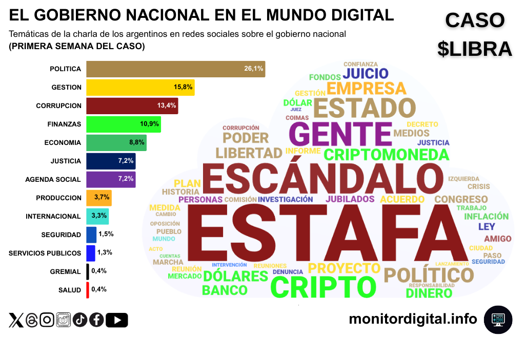 - $LIBRA: los principales ejes fueron política (26,1%), gestión (15,8%), corrupción (13,4%) y finanzas (10,9%). La categoría de finanzas y la presencia de términos como “cripto” o “banco” muestran que la charla se ancló más en una suerte de "imprudencia financiera" más que en la corrupción gubernamental.