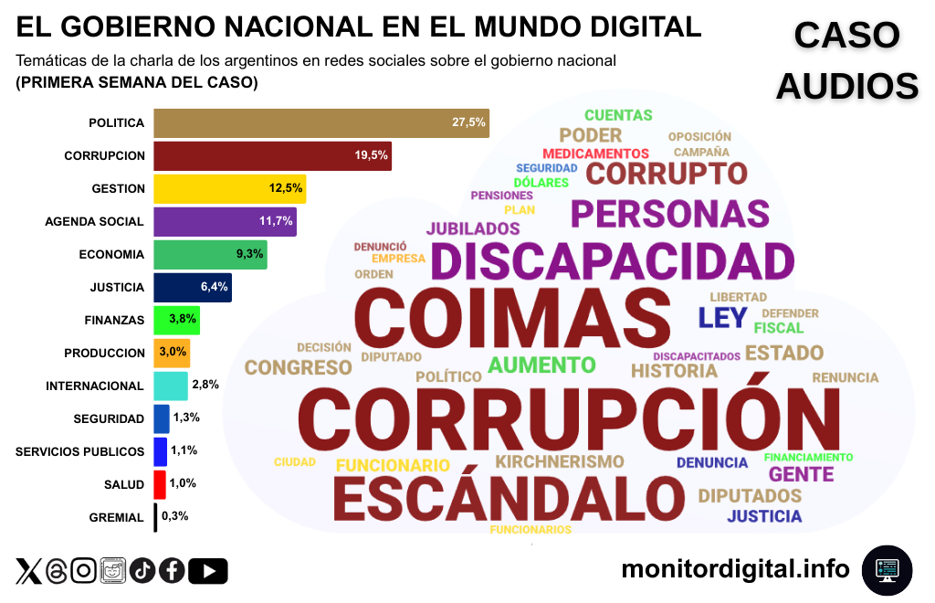 - Audios: la conversación se estructuró en torno a política (27,5%), corrupción (19,5%) y gestión (12,5%), con un peso adicional en agenda social (11,7%). Palabras como “discapacidad” o “programas sociales” reforzaron la idea de un impacto social profundo.