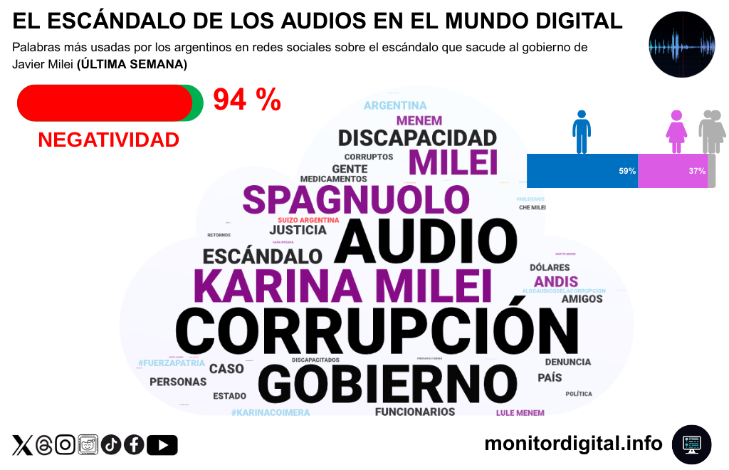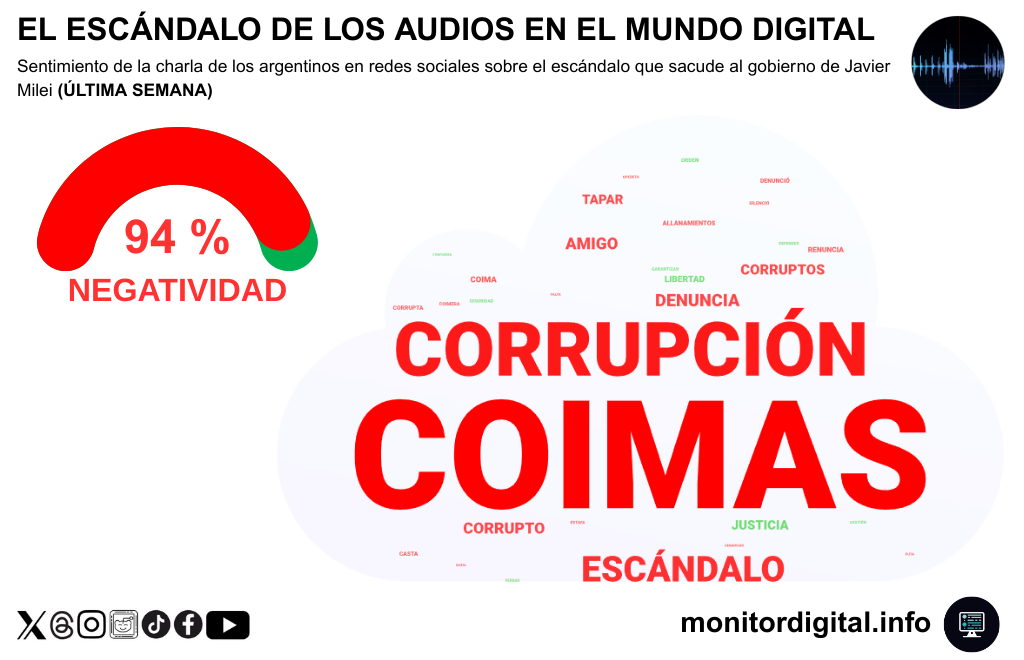 Durante la última semana, el escándalo de los audios de Diego Spagnuolo revelando supuestos entramados de corrupción en la administración nacional generó un clima digital abrumadoramente negativo en las redes sociales (94%).