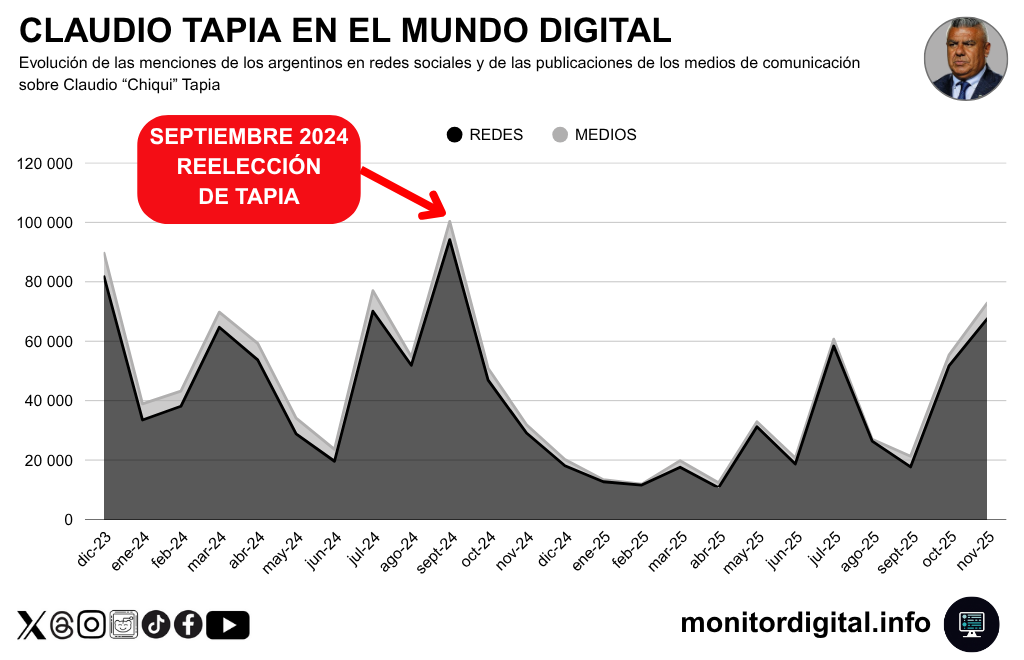 La curva de menciones muestra con claridad el doble ciclo que atraviesa la figura de Claudio Tapia en el ecosistema digital.