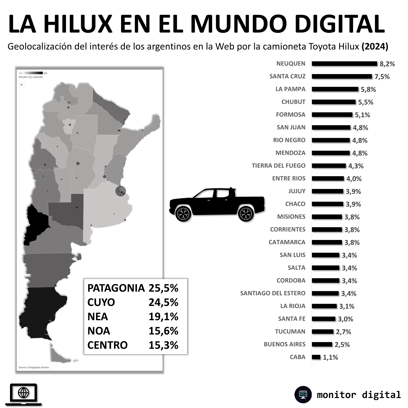 Durante el año pasado, la provincia con mayores volúmenes de búsquedas por la Toyota Hilux los obtuvo Neuquén (corazón del floreciente negocio del gas y petróleo no convencional) con algo más del 8% del total del país.
