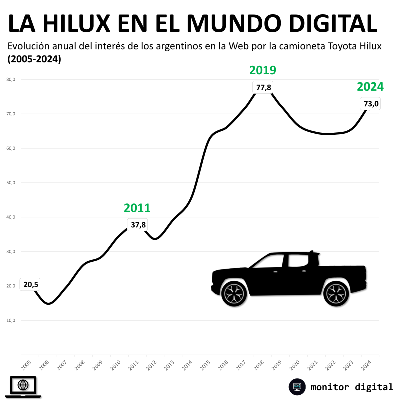 Tomando como campo de análisis el interés de los argentinos en la Web por la camioneta Hilux de Toyota (la más vendida desde hace varios años y con más del 7% del mercado automotor argentino), los resultados saltan a la vista.