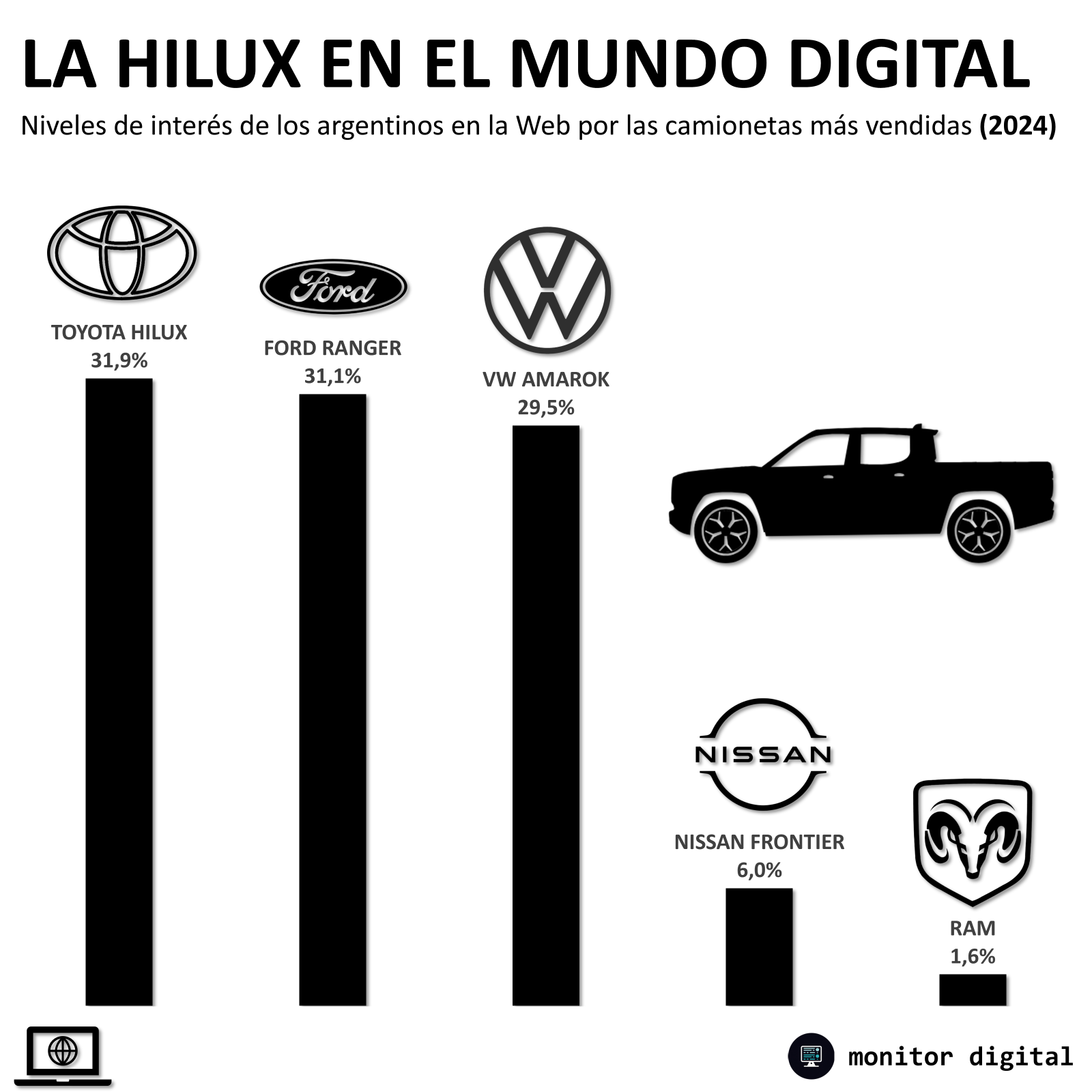 En 2024, la Hilux fue la camioneta con mayores volúmenes de búsquedas en Google, superando por poco margen a la Ford Ranger y a la VW Amarok.