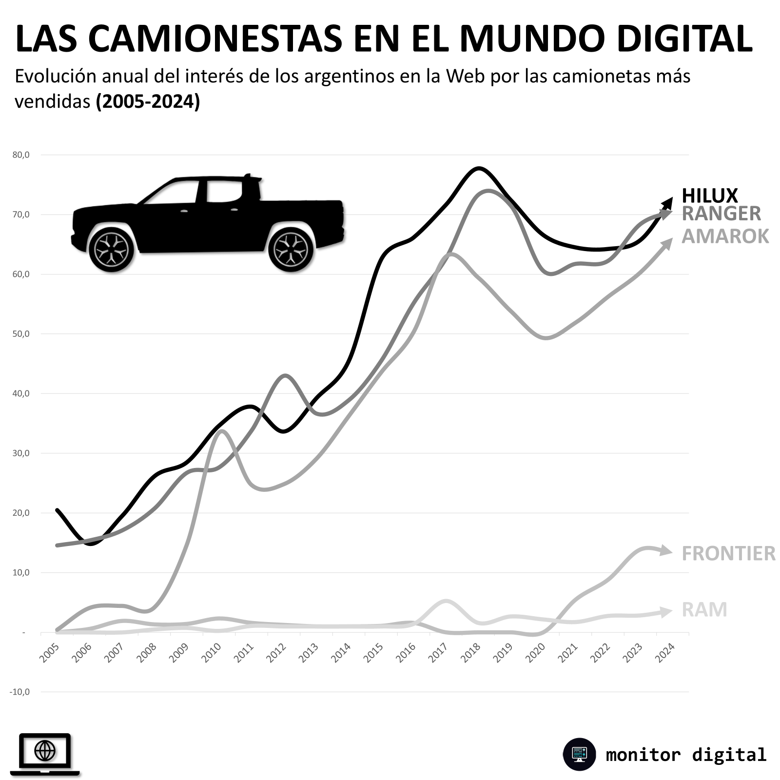 Ampliando el análisis al resto de las camionetas más vendidas en la Argentina, las competidoras de la Hilux experimentaron casi la misma dinámica en Google durante los últimos 20 años: picos de crecimiento en las búsquedas online hacia 2011, récord de interés en 2019 con caídas en los meses siguientes y recuperación entre 2023 y 2024.