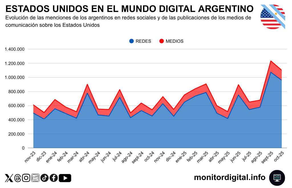 Estados Unidos aparece como un actor estructurante en el ecosistema digital argentino, con un volumen sostenido de conversación que crece en los momentos de mayor tensión política y económica.