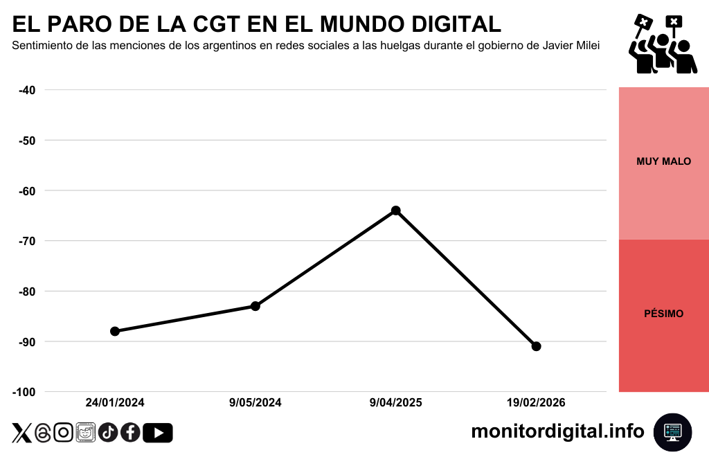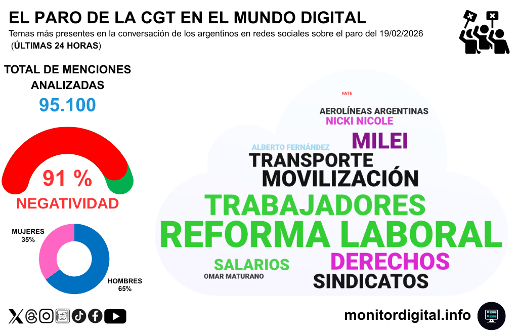El análisis de la conversación en redes sociales sobre el paro del 19 de febrero, en base a 95.100 menciones en las últimas 24 horas, reflejó una negatividad elevadísima del 91%.