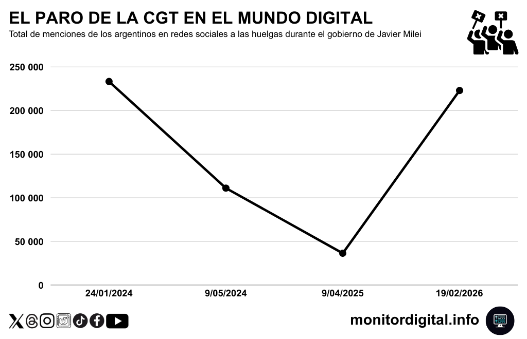 El cuarto y último paro del 19/02/2026 retoma las menciones en aumento, para alcanzar valores similares a la primera huelga contra el gobierno de Milei: 225.000 menciones.